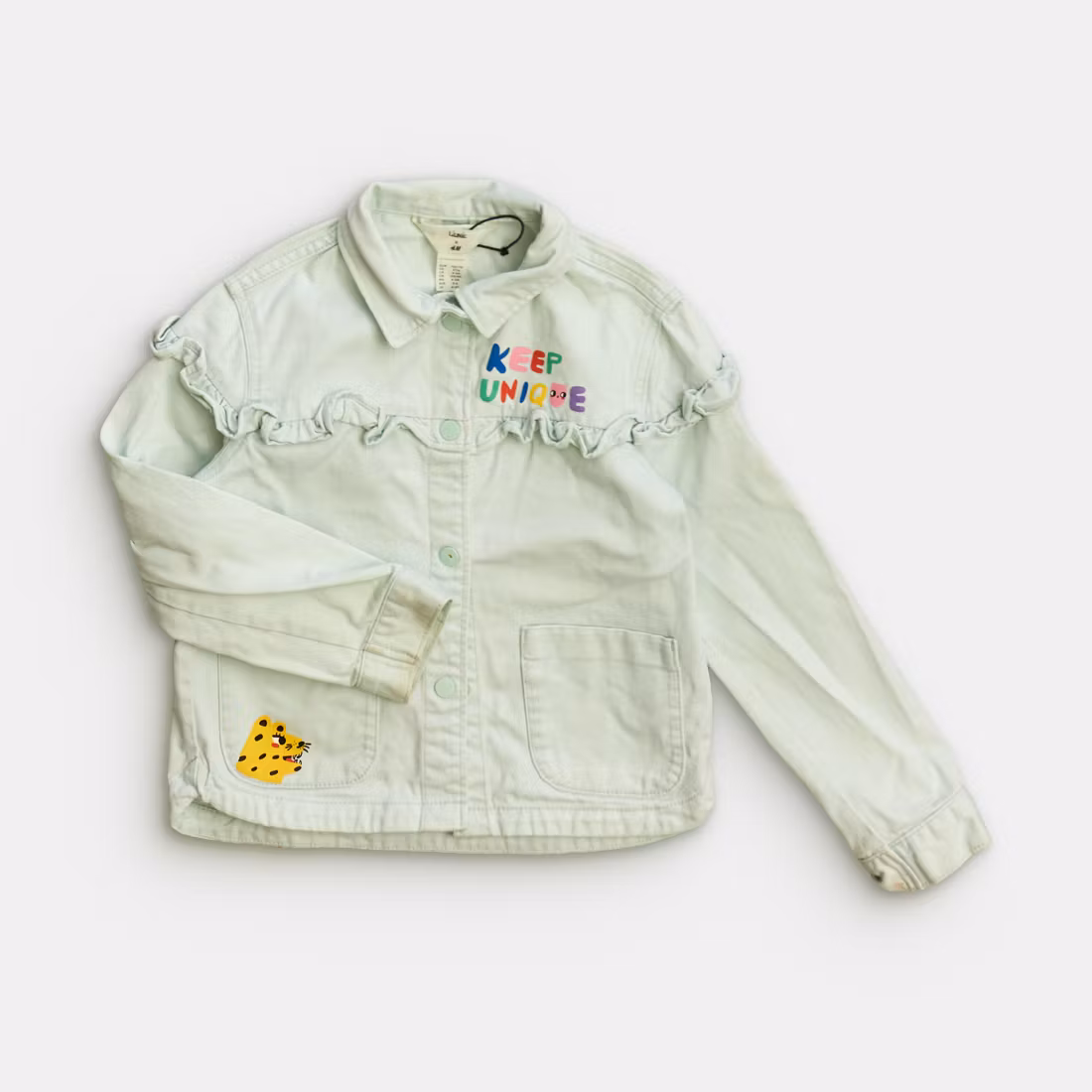 1 jeansjacka från H&M i skick A.Print på baksidan av plagget. Liten fläck på ena ärmslutet.