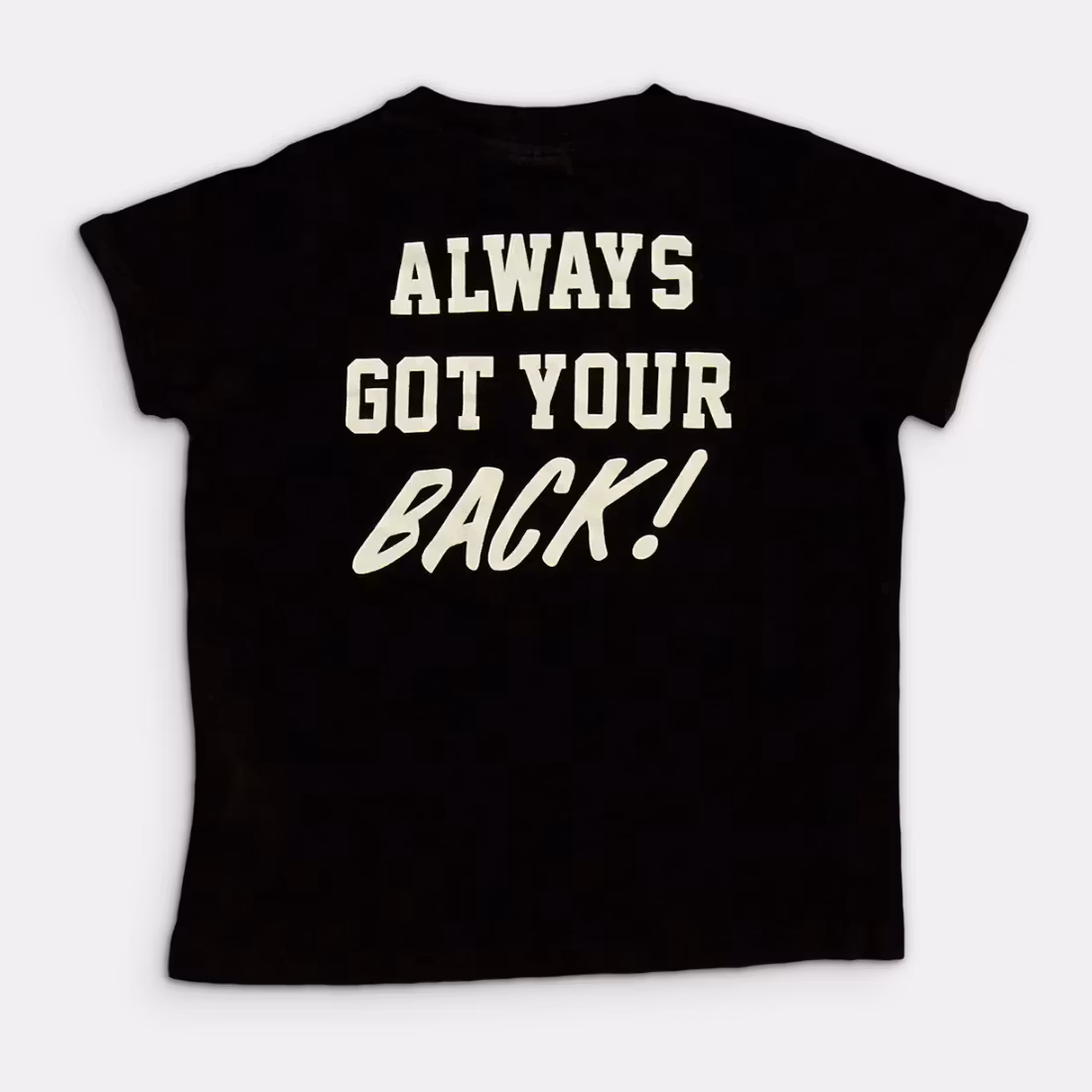 - Bild visar print på ryggen. Litet print fram på bröst