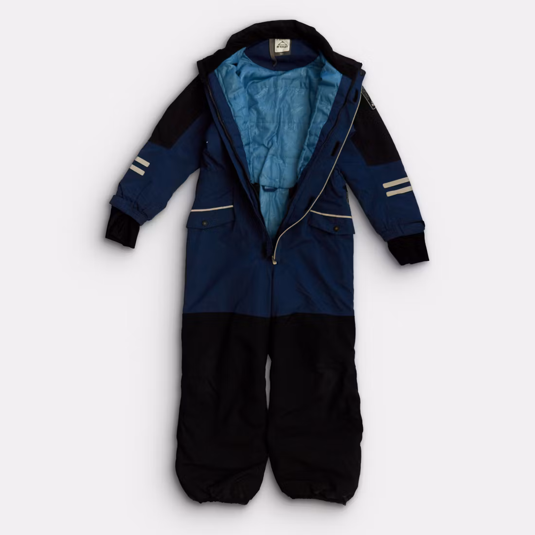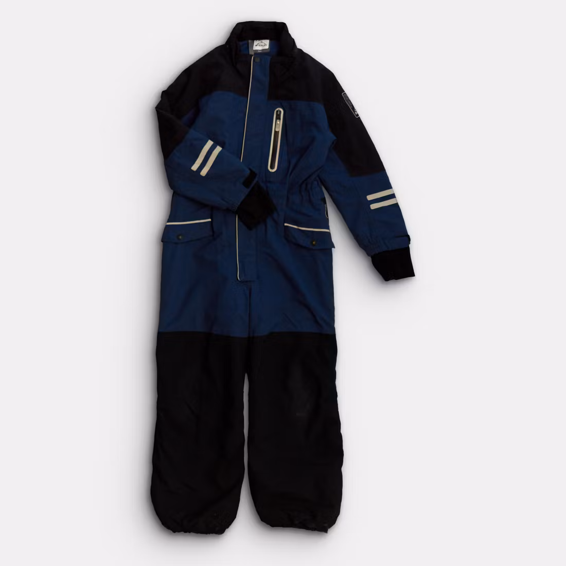 - Saknar luva. Små slitningar på tyg, påverkar ej funktionen. Bra lagning med laglapp på knä och benslut. Saknar fothällor, ej utbytbara.